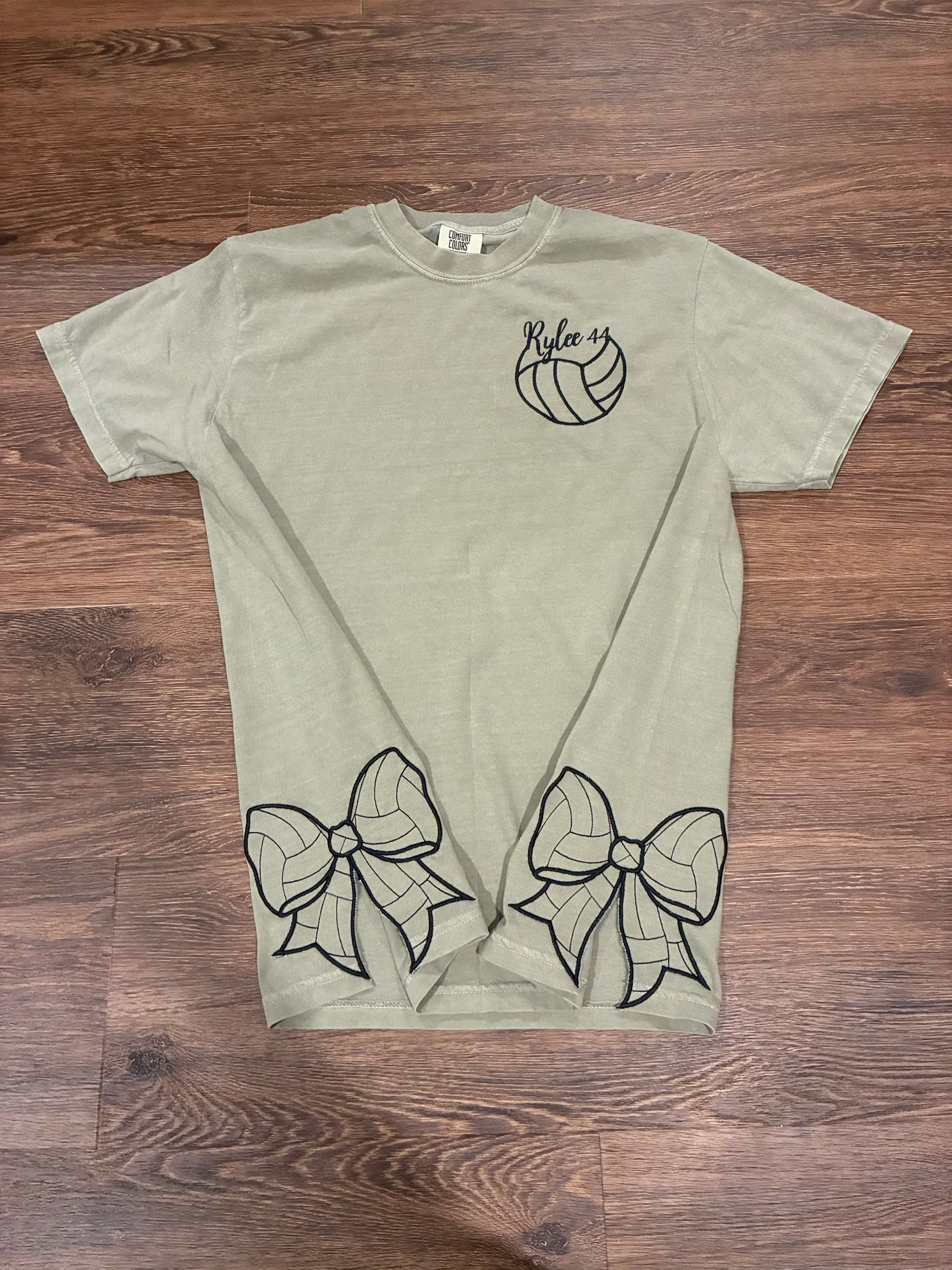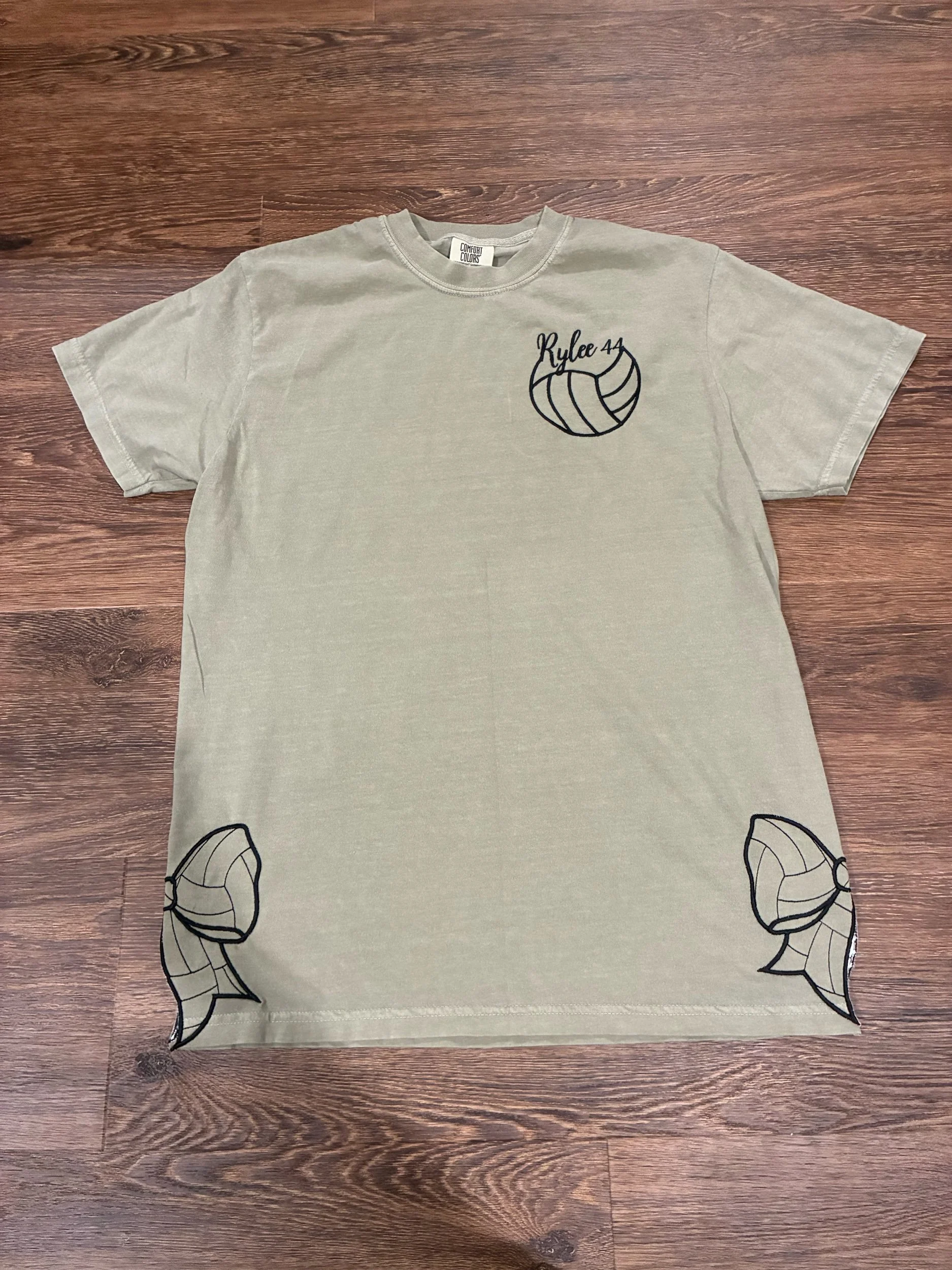 Featuring a personalized name and number inside a volleyball design on the chest, plus unique embroidered volleyball accents at the hem, this shirt adds a fun and sporty twist to everyday wear. The subtle placement keeps it stylish, while the custom touches make it meaningful.